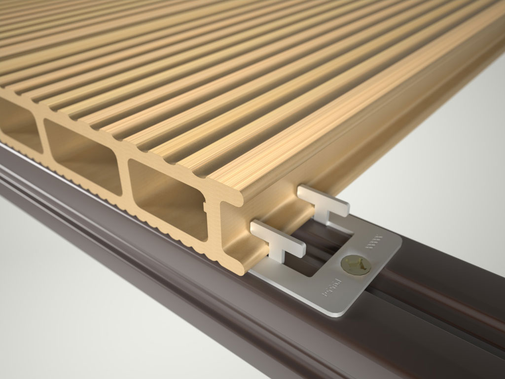 Террасная доска имеет такой состав. Используя тепловой эффект и под действием высокого давления прессуют древесную муку, специальную примесь и высокой плотности полиэтиленовый пластик. Террасная доска не требует особого ухода, она защищена от действия ультрафиолета. Террасная доска такого производства имеет длительный срок службы, сохраняя при этом натуральный цвет. Производители террасной доски, пишет Инфобуд, сегодня обеспечивают ее стойкость к термитам, гниению, загрязнению и их продукт не требует постоянной покраски. Террасная доска имеет высокую огнеустойчивость. Современная терасная доска еще на этапе производства обеспечивается специальными скрытыми фиксаторами. С помощью такого крепления покрытие из террасной доски выглядит идеально.